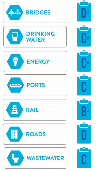 ASCE’s Infrastructure Report Card provides a comprehensive assessment of current infrastructure conditions and needs, assigning grades and making recommendations to raise them. The 2017 Report Card found the national grade for infrastructure to be a D+.